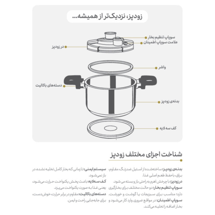 زودپزهای جدید پارس استیل مدل وستا، در دو اندازه 4 و 6 لیتری، یک انتخاب حرفهای و مطمئن برای خانوادههایی است که به دنبال ترکیبی از کیفیت، ایمنی و سرعت در آشپزی هستند. این زودپز با بدنهای از استیل ضدزنگ براق و کف سه لایه می باشد که باعث پخش یکنواخت حرارت شده و می توان پختی عالی را حتی با گازهای القایی تجربه کرد. وجود سوپاپ بخار با دو حالت تنظیم فشار، امکان پخت انواع غذا، از خورشت و گوشت گرفته تا سبزیجات را با کنترل دلخواه به شما میدهد. همچنین سوپاپ اطمینان و سیستم ایمنی قفل درب، تضمین میکنند تا استفاده از آن کاملاً ایمن باشد. اگر به دنبال یک زودپز با دوام، زیبا و کاربردی هستید، زودپز پارس استیل مدل وستا گزینهای است که آشپزی را برایتان لذتبخشتر و سریعتر خواهد کرد.