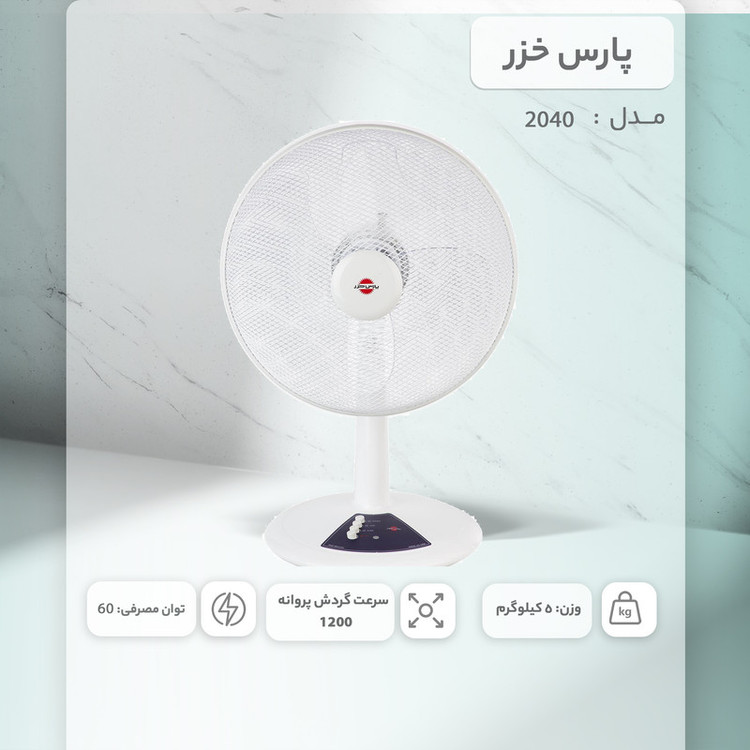 پنکه «پارسخزر» مدل «2040» از پنکههای طرح رومیزی استکه توسط اینشرکت تولید و بهبازار عرضه شده است. پنکهها همچنان از دستگاههای سرمایشی محبوب هستند که در خانه و ادارات کاربرد فراوانی دارند. از مزایای پنکهها نسبتبه دیگر دستگاههای سرمایشی میتوان به امکان جابجایی آسان، قابلیت تنظیم زاویه وزش باد و همچنین وزش باد با گردش افقی اشاره کرد. این مدل دارای چهار پره شفاف است که بین دو صفحه محافظ مشبک قرار گرفته است. کاربر ازطریق کلیدهای تعبیهشده روی پایه، قادر به خاموش و روشن کردن و تغییر تنظیمات دستگاه است. قابلیت تنظیم گردش افقی نیز از دیگر مشخصاتی است که میتواند به کارایی این دستگاه برای خنککردن محیط موردنظر اضافهکند. این دستگاه بهراحتی بهمحل موردنظر جابهجا میشود. طراحی کلاسیک پنکه رومیزی پارسخزر 2040 به رنگ سفید و پایه زیبای این مدل آنرا به انتخابی قابلتأمل برای مصرفکنندگان مختلف تبدیل میسازد. از دیگر قابلیتهای این دستگاه میتوان به موتور مجهز به فیوز حرارتی آن اشاره کرد که نگرانیهای حاصلاز فعالیت طولانیمدت این دستگاه را مرتفع میسازد. لازمبهذکر است پنکه رومیزی پارسخزر 2040 از گواهینامه استاندارد ایمنی محصول و همچنین نشان استاندارد اروپایی CE نیز بهره میبرد. این پنکه کممصرف بوده و تنها 5 کیلوگرم وزن دارد و توانمصرفی آن حداکثر 60 وات است.