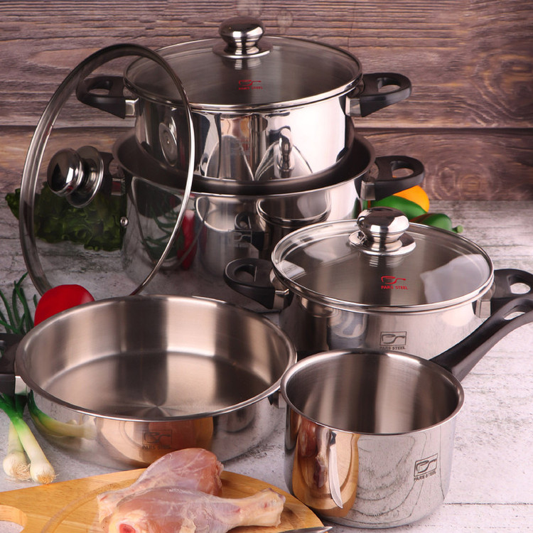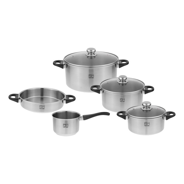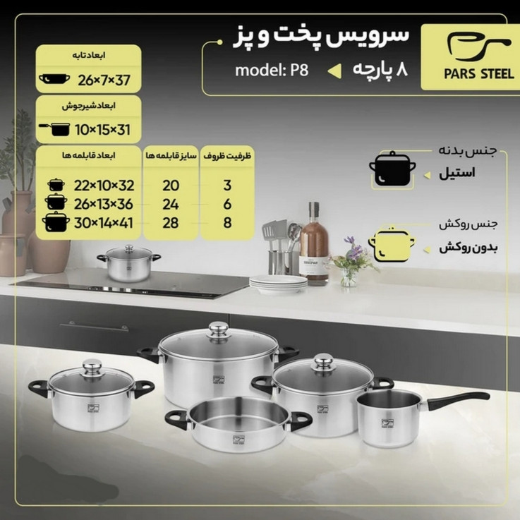 سرویس پخت و پز 8 پارچه پارس استیل مدل 08 ساخته شده از استیل ضدزنگ و دارای کیفیت بسیار بالاست. این ست زیبا بهدلیل نداشتن روکش یکی از سالمترین ظروفی است که برای آشپزی مورد استفاده قرار میگیرد. سرویس 8 پارچهی پارس استیل شامل 3 عدد قابلمه، 1 عدد شیرجوش و یک عدد تابه است و قابلمهها دارای در هستند که در مجموع 8 پارچه را تشکیل میدهند. این سرویس قابلمه و تابه دستههایی از جنس باکالیت دارد که از مقاومت مطلوبی دربرابر حرارت برخوردار هستند. درپوشهای این سرویس از جنس پیرکس هستند که برای مقاومت بیشتر قاب فلزی دارند و برای خروج بخار نیز روی درپوشها سوپاپ طراحی شده است. سطوح ظروف ضدخش است و با خیالی آسوده میتوانید برای تمیزی بهتر آنها را در ماشین ظرفشویی شستوشو دهید. کفی ضخیم ظروف دوجداره است و از سوختن و چسبیدن غذا جلوگیری میکند. شرکت پارس استیل بهعنوان تولیدکنندهی قابلمه و زودپز تماماستیل در ایران از سال 1363 فعالیتش را آغاز کرده است. این شرکت با استفاده از بهترین تکنولوژی روز، همواره سعی در تولید محصولاتی با کیفیت بالا و قابلرقابت در بازارهای جهانی داشته است.